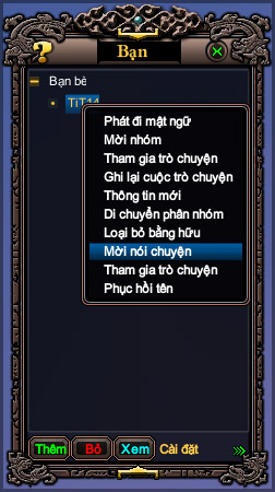 Ví dụ: Bạn của bạn nằm trong danh sách "bạn bè", bạn muốn mời họ tham gia trò chuyện. Bạn hãy click chuột phải vào tên nhân vật bạn muốn mời, sau đó bạn chọn dòng "Mời nói chuyện".