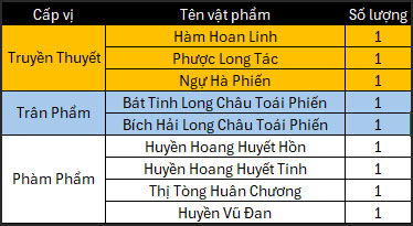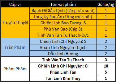- Vật phẩm không giới hạn có xác suất cơ bản được chia đều tương ứng theo cấp phẩm.